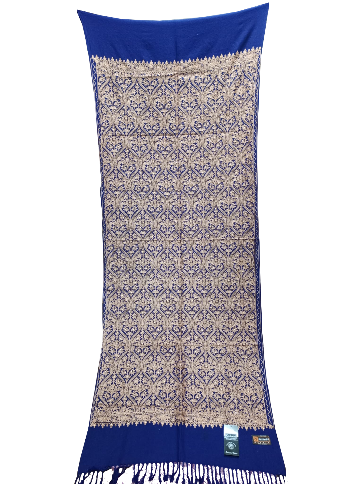 • Finishing Touches: The edges are finished with a delicate embroidered border and traditional fringe/tassels at both ends, giving it a classic, elegant drape.