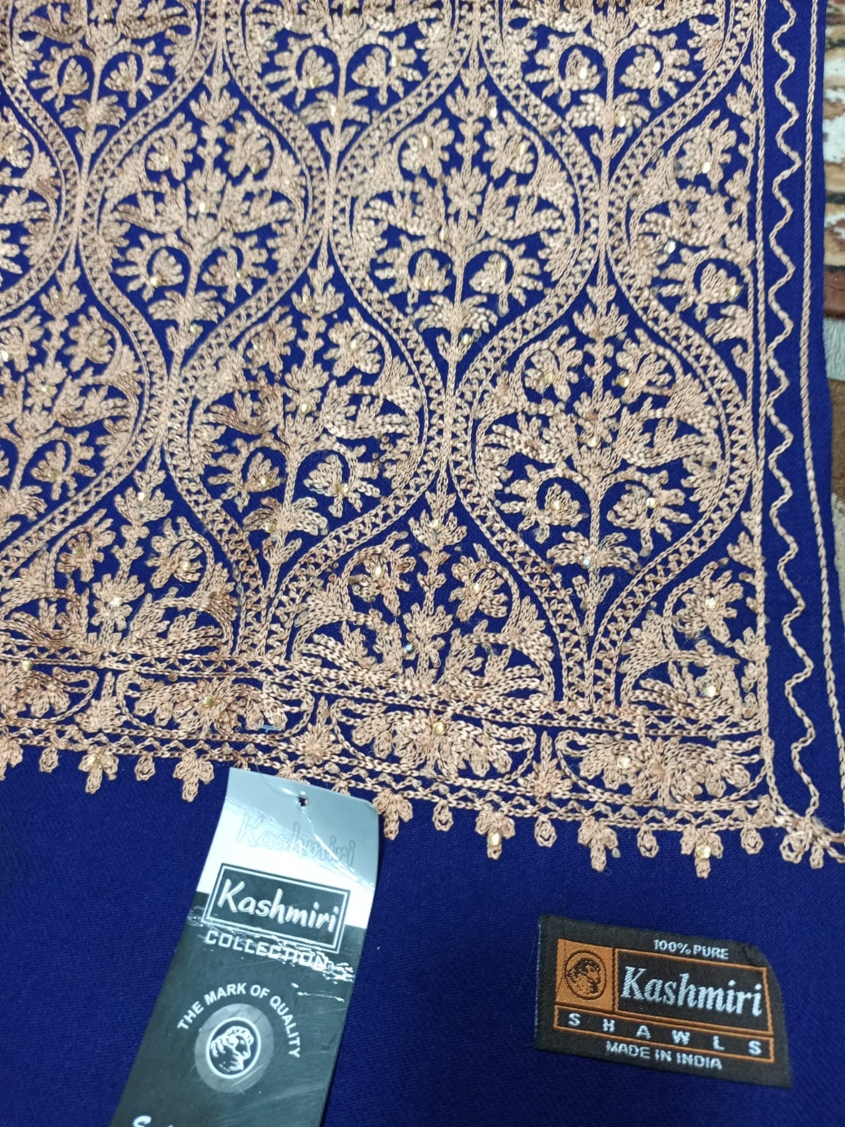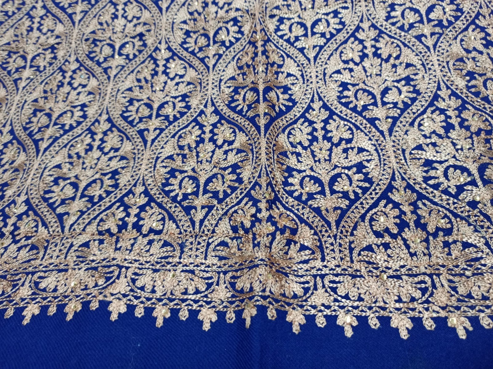 This is an exquisite, high-quality Kashmiri-style shawl (often referred to as a “Jaal” or “Jamawar” pattern). The shawl features a striking deep navy blue base, beautifully contrasted by an intricate, full-coverage gold/beige embroidery.