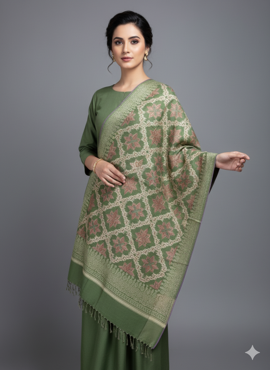 Traditional Tassels: Finished with classic, neat tassels along the edges, the shawl maintains a traditional, flowing grace and beautiful movement.