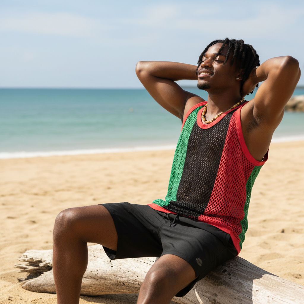 Step into the spotlight with this eye-catching Men’s Marcus Garvey String Mesh Vest. Designed for those who dare to stand out, this vest combines ultimate breathability with a striking aesthetic. Perfect for making a statement at the gym, a festival, or a summer party, its comfortable fit and vibrant Marcus Garvey colours ensure you’ll look and feel great.